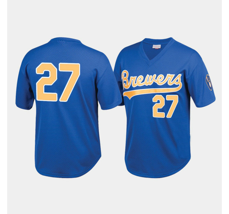 - Men's Brewers #27 Royal Mesh Batting Practice Cooperstown Collection Jersey