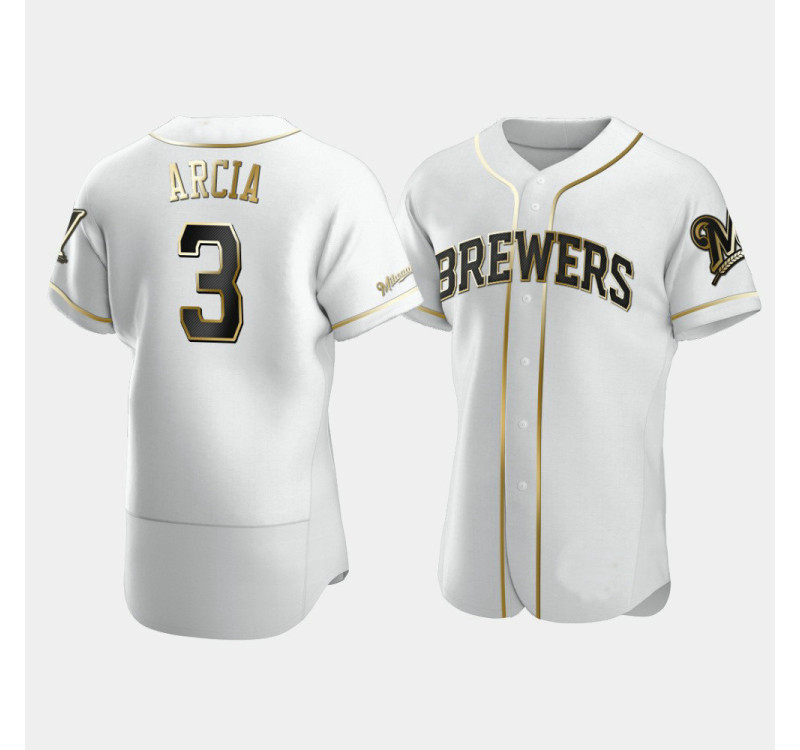 - Men's Brewers #3 Orlando Arcia White Golden Edition Authentic Jersey
