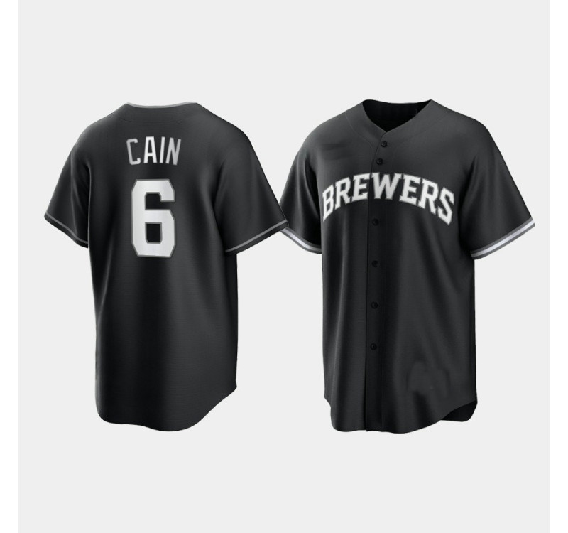 - Brewers Lorenzo Cain Black White 2021 All Black Fashion Replica Jersey