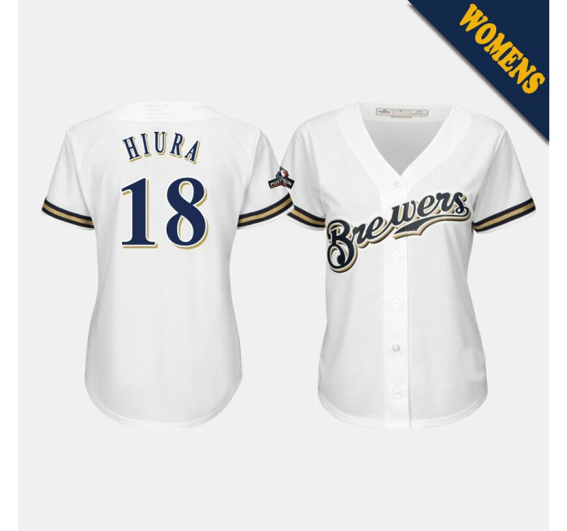 • Brewers Women's #18 Keston Hiura 2019 Postseason White Official Cool Base Jersey